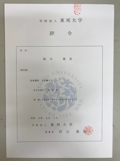 東邦大学客員講師の辞令を頂きました。 …