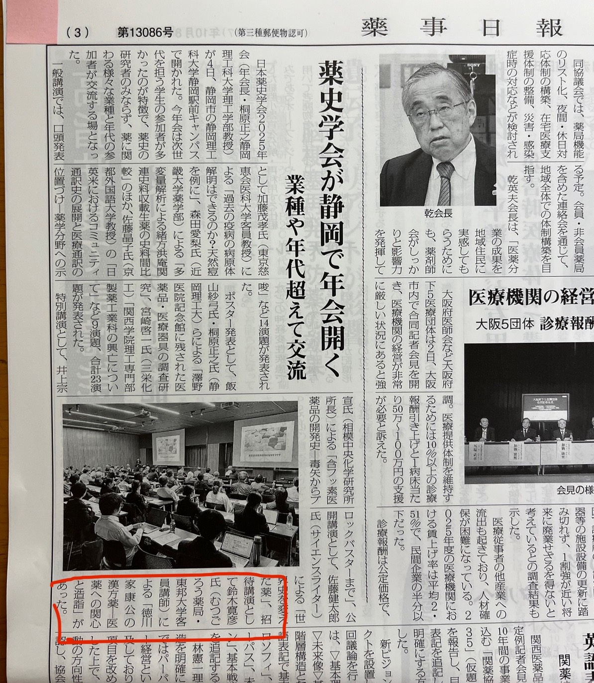 ・業界誌の薬事日報に、静岡市開催、薬史学会年会